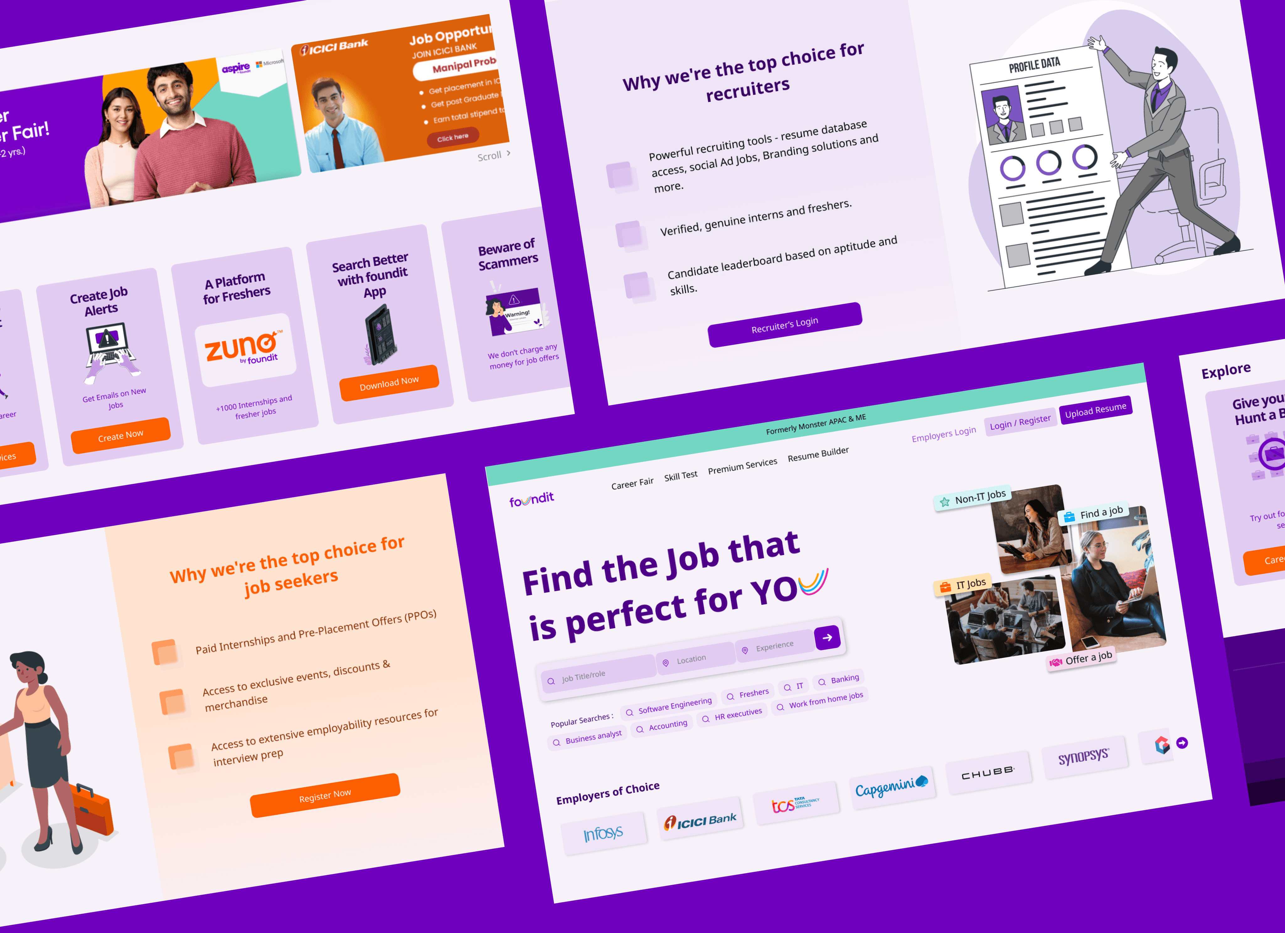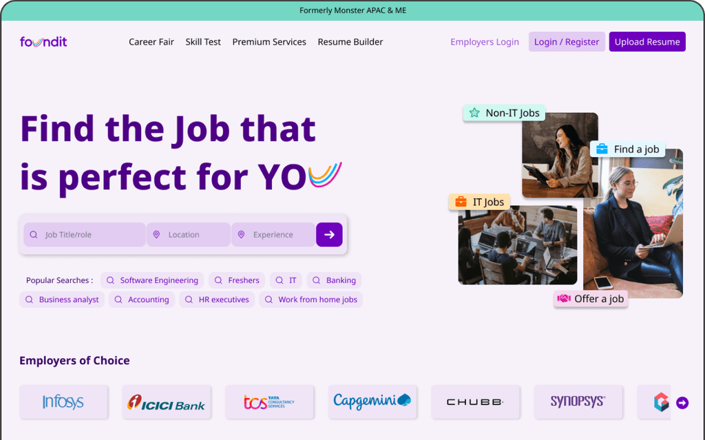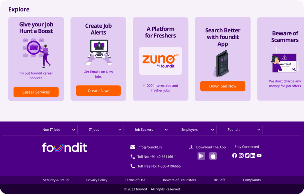 Foundit is a platform for job seekers to find various job opportunities and recruiters for offering jobs. It offers features and resources that make it easier for people to find and offer jobs.This website design was a part of a UI/UX constest hosted by Zuno, foundit.